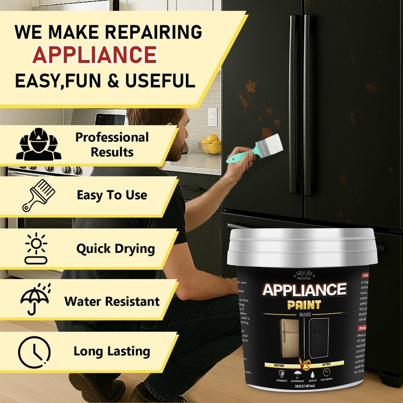 Restore the look of your appliances without the cost of replacement. MEUVCOL Appliance Paint Black is a premium water-based paint designed specifically for metal and plastic surfaces on common household appliances. Whether you're covering up scratches, rust, or yellowing, this low-odor formula delivers a smooth, matte finish that instantly refreshes refrigerators, washers, dryers, dishwashers, microwaves, and more. The all-in-one kit includes a high-coverage paint bottle, application brush, masking tape, gloves, and sandpaper—giving you everything needed for easy, mess-free touch-ups or full refinishing projects. Safe for indoor use with low VOCs, this paint is ideal for enclosed spaces like kitchens, laundry rooms, and RVs. The tough, chip-resistant formula resists heat, moisture, and daily wear, making your appliances look like new for years to come. Whether you're tackling a DIY home renovation or simply giving second-hand appliances a fresh start, MEUVCOL makes restoration easy, affordable, and professional.