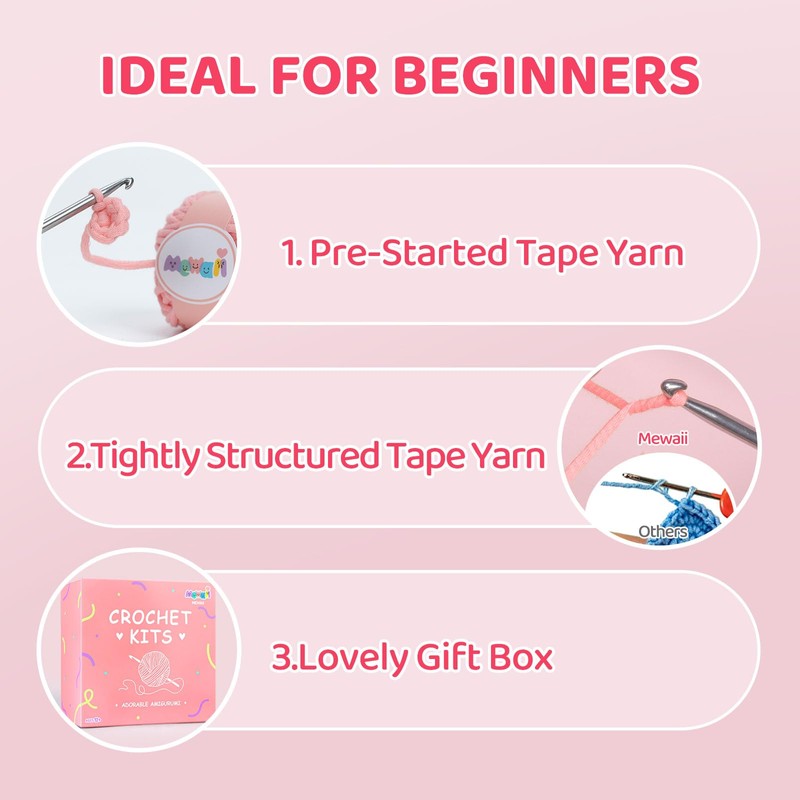 - 🧶Pre-Started Tape Yarn - Compared to ordinary yarns, the Mewaii crochet kit provides beginners with tightly structured tape yarn that is easy to work with. The pre-started yarn makes it simple to start your crocheting project. You have the option to start your first own row of stitches, as we have provided enough yarn to ensure you won't run out.