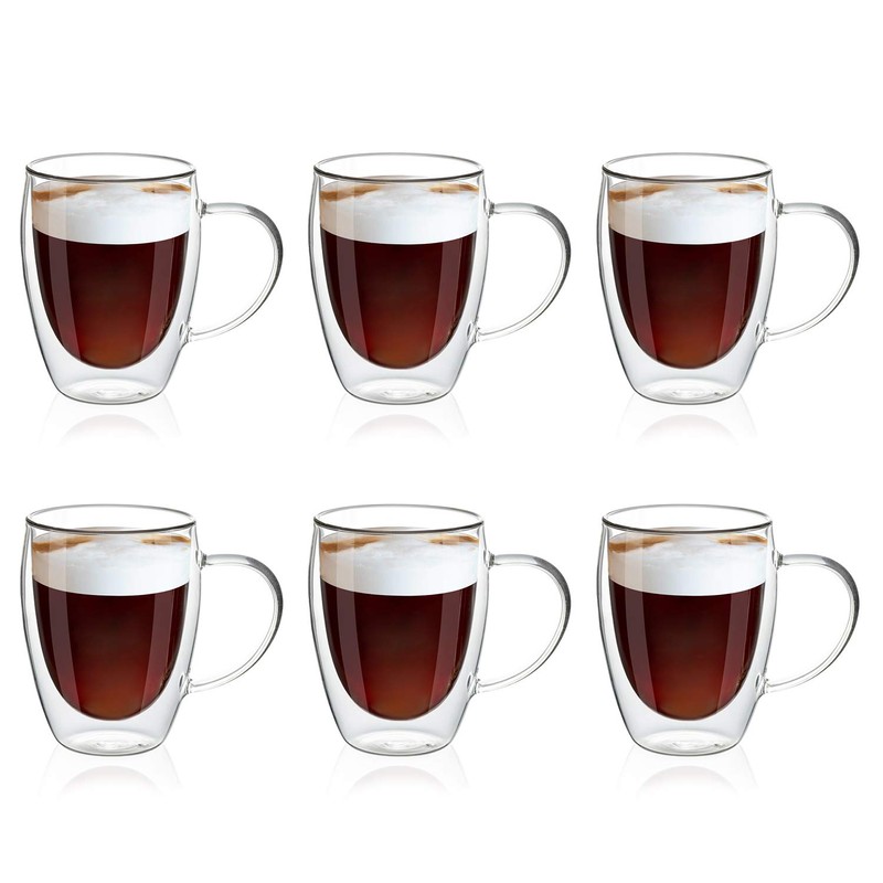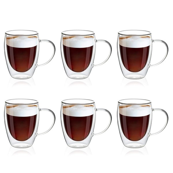 MEWAY 12oz/6 pack Coffee Mugs,Clear Glass Double Wall Cup with handle for Coffee, Tea, Latte, Cappuccino (12 oz,6)