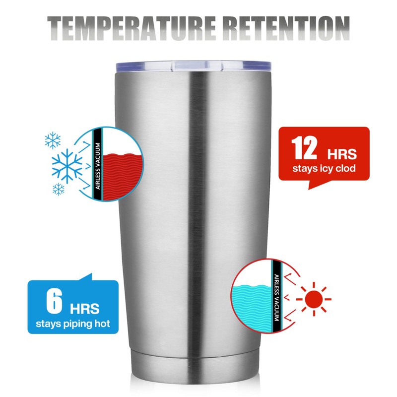 - Aislamiento al vacío de doble pared: Disfruta de bebidas frías o calientes. A temperatura normal, puede mantener un vaso de pastel helado durante 12 horas hasta que el hielo se derrita totalmente, o el café caliente durante 6 horas.