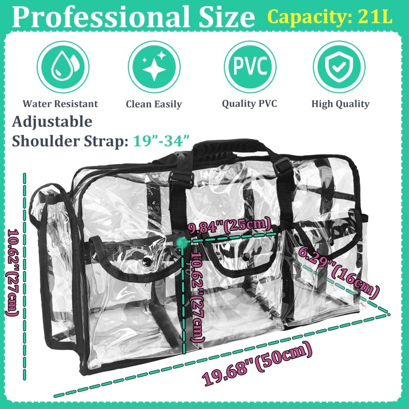 2.Material: The large clear tote makeup kit organizer bag material is PVC, lightweight material suitable for all-day carrying, with certain softness and easy to clean. The shoulder strap and handle has softness heavy duty design, friendly to shoulders and hands.