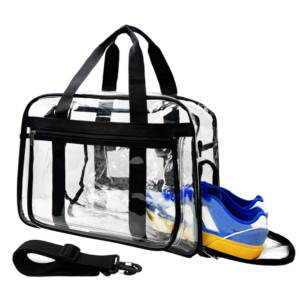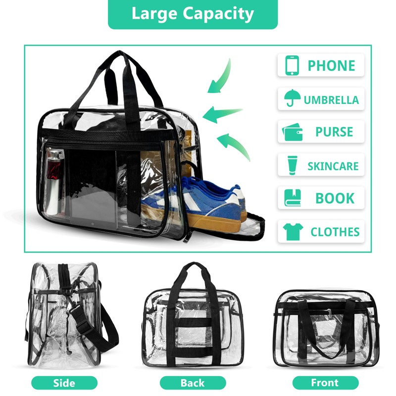 - Multi-useSimple and fashion for daily. The large clear tote bag can be used as weekender travel overnight bag, carry on bags for airplanes and sports gym bag. Suitable for many occasions, it can be your ideal choice for travel, daily work, business trips, shopping, sport or activities.