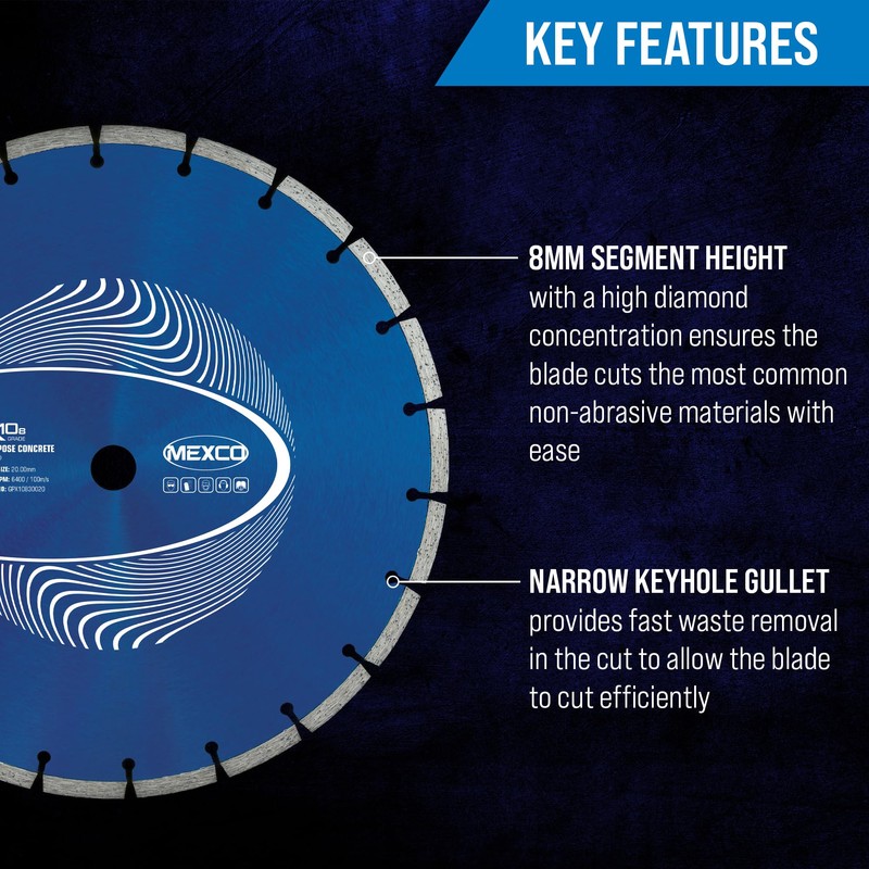 - High Diamond Grit Concentration – The performance of the Mexco Concrete Diamond Blade can be attributed to its high diamond concentration, producing a fast and accurate cut, whilst maintaining sharpness and retaining cutting performance for a longer blade lifespan