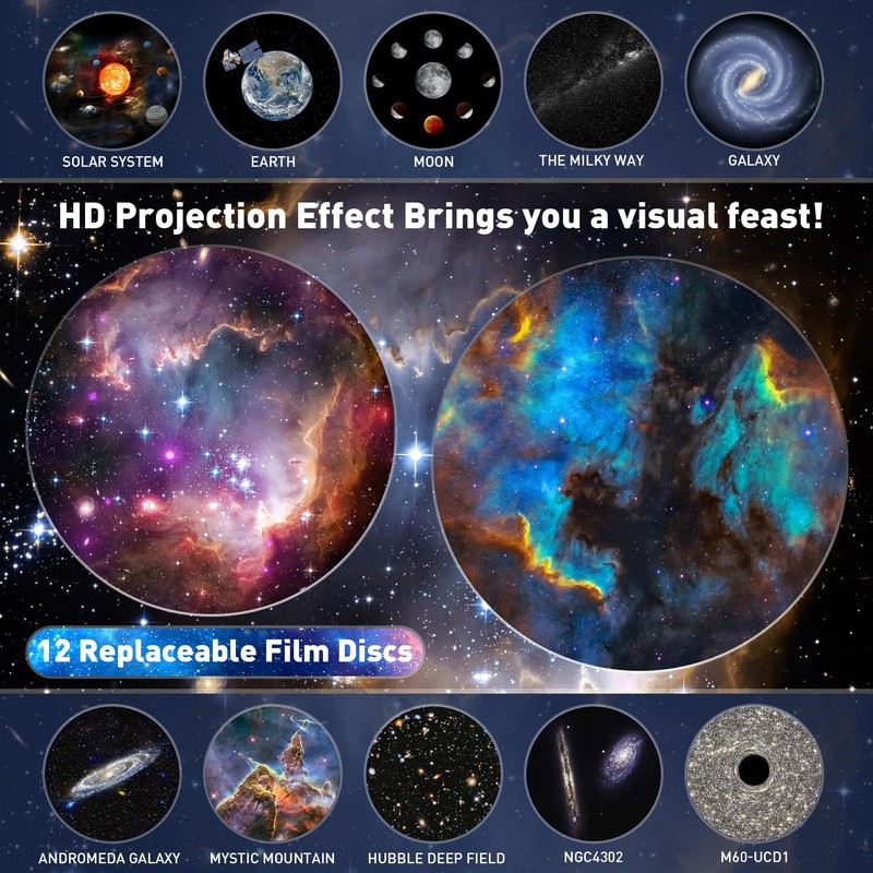 - HD Realistic Planetarium Projector This planetarium star projector is equipped with 12 film discs that show planets and natural lights. HD galaxy lights illuminate walls and ceilings with stars and nebulae, creating an immersive experience that takes you to the depths of a galaxy.