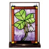 Meyda Lighting 1 Lt 9.5" x 10.5" Shamrock Lighted Mini Window, AMB/GR - 50036 The Luck of the Irish comes to light beautifully with a Green Shamrock and White Lily against Purple art glass; which is bordered in Rootbeer art glass with Amber colored glass jewels. Illuminated from a bulb located behind the glass; the mini tabletop stained glass window is creating using the famous Meyda copperfoil construction process. This mini window is encased in a solid brass channel frame and hangs perfectly in its own brass tabletop display. Custom sizes; designs and colors are available.- Part of the Shamrock Collection