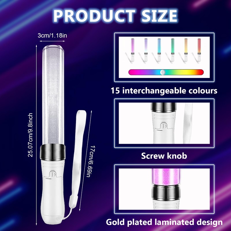 - - **Reusable**: The total length of the children's glow stick is 25 cm, the diameter of the tube is 3 cm, it must be powered by 3 AAA batteries (batteries are not included), it can be reused by replacing the batteries.