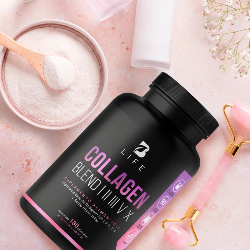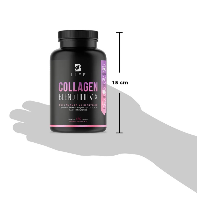¡Disfruta la formulación exclusiva de Collagen Blend I, II, III, V, X B Life®! Cada cápsula de 500 mg contiene nuestra excepcional mezcla de 5 tipos altamente absorbentes del Colágeno: I, II, III, V y X es una composición valiosa para tu bienestar. Además de estar enriquecida con Vitamina C y Ácido Hialurónico, activos importantes que otras fórmulas carecen. Contiene 180 cápsulas.