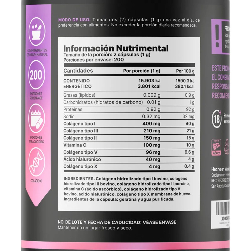 Mezcla avanzada de 5 tipos de colágeno para apoyar desde la elasticidad de la piel hasta la regeneración de cartílagos y tejidos.