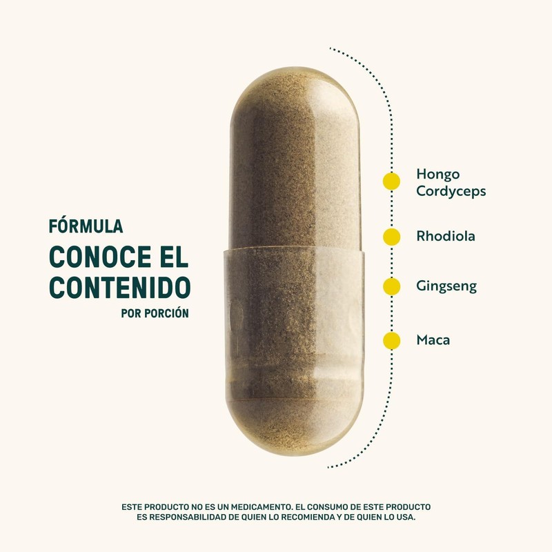 - FORMULA ÚNICA: Cada cápsula contiene Cordyceps (Cordyceps Militaris), Rhodiola (Rhodiola Rosea), Maca Amarilla (Lepidium Meyenii) y Ginseng (Panax Ginseng). No exceda la porción de 2 cápsulas por dia.