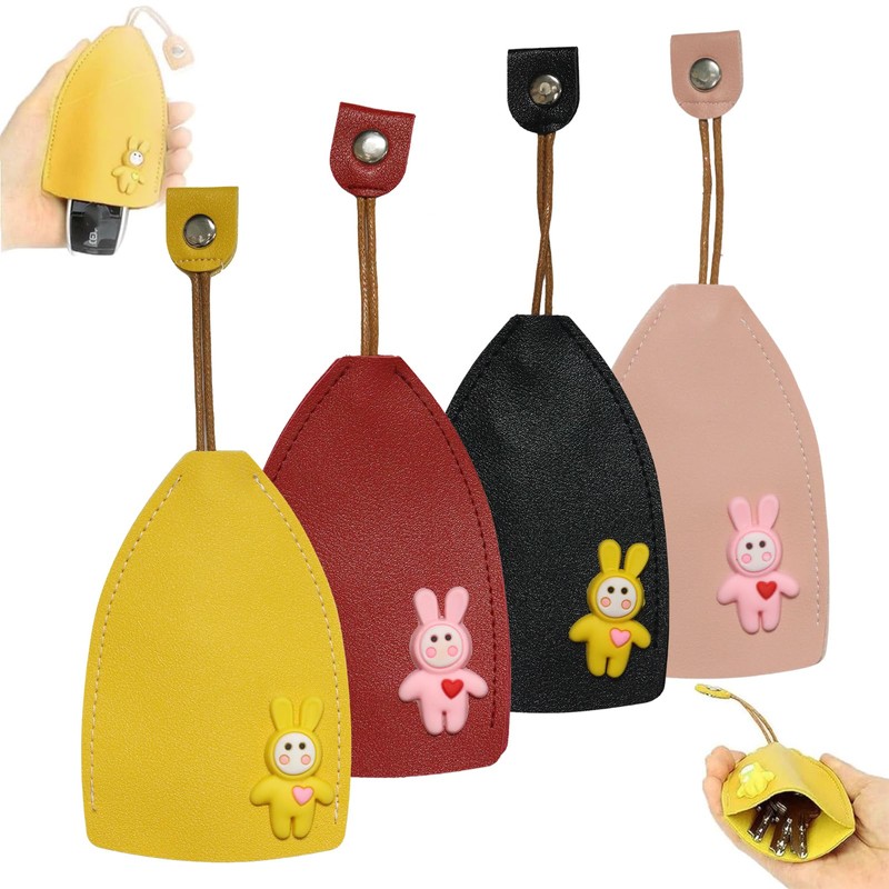 Mezrkuwr Pack of 4 Leather Key Chains, Retractable Key Bag in Rabbit Design, Anti-Collision and Anti-Friction Durable, Can Hold Car Keys