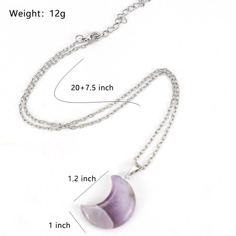 - Crescent Moon Stone Pendant Necklace--The Crescent Moon Stone Necklaces have a 20 inch chain and a 7.5 inch extension chain, and the crescent pendant is 1.2 inches long, 1 inch wide, and weighs 12 g