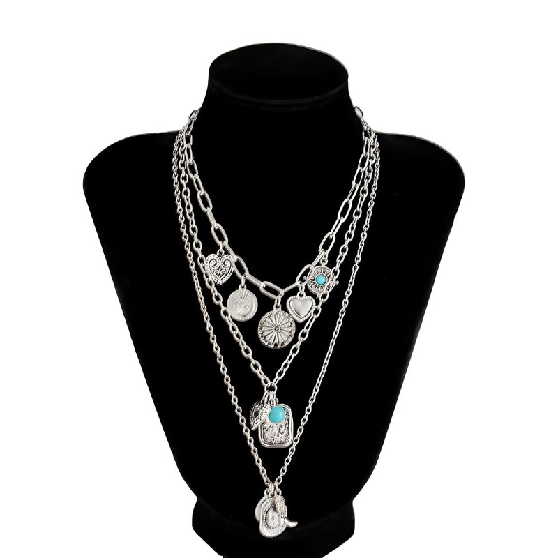 MGFESIO Western Cowgirl Multi-Layered Necklace Set, Cowboy Boot and Charm Pendants, Silver and Gold Tone Chains with Turquoise Accents (Silver 1)