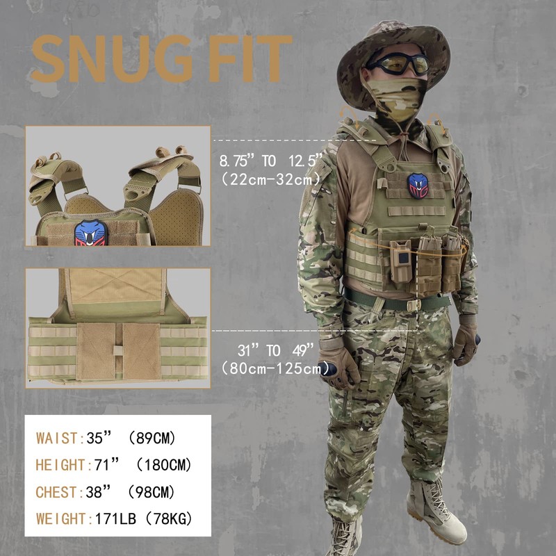 - Fully Adjustable - The cummerbund, internal waist strap and shoulder strap are adjustable. This airsoft vest will fit 31" - 49" waist. Please note this important size information before placing an order.