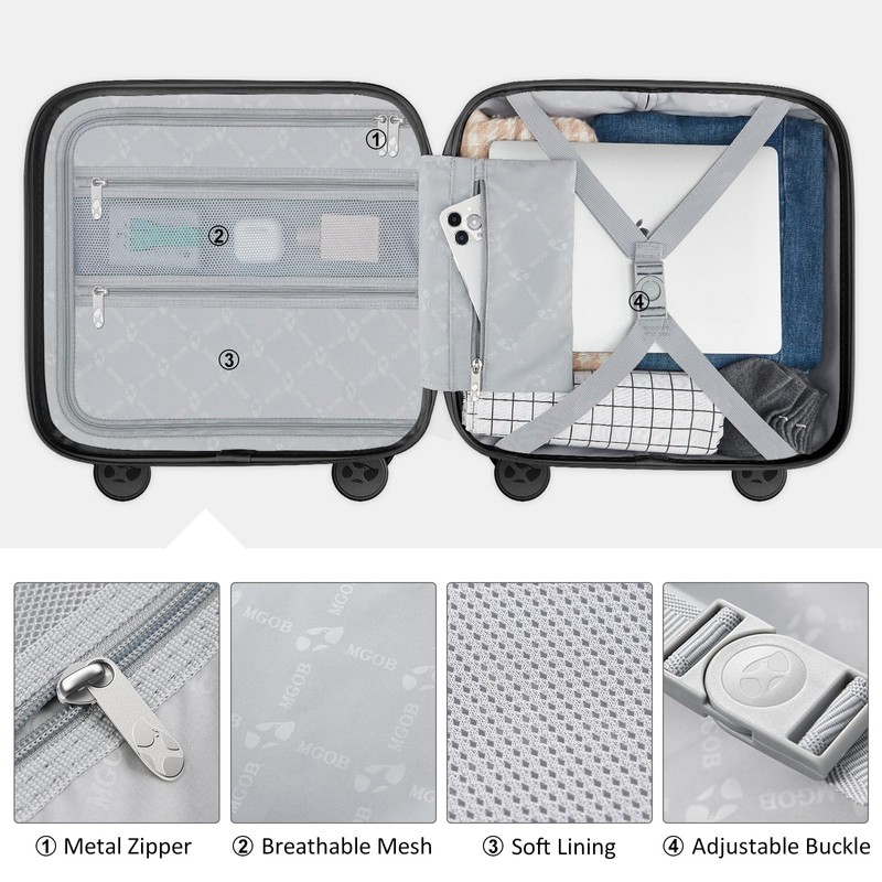 MGOB 16 Inch Airline Approved Underseat Carry-On Luggage, Lightweight Polycarbonate Hardshell with 360° Spinner Wheels & TSA Lock, Compact Suitcase (Black)