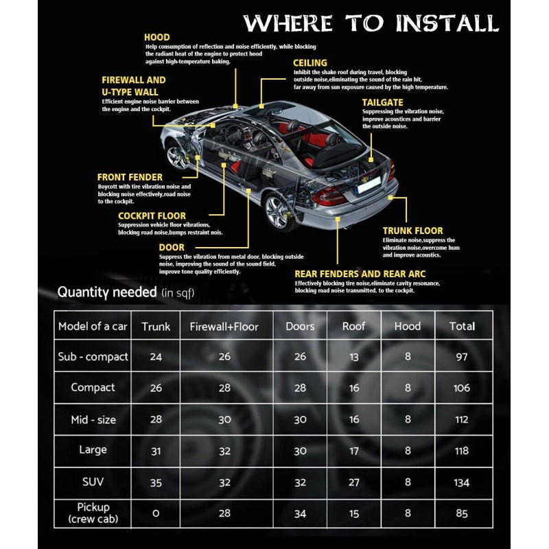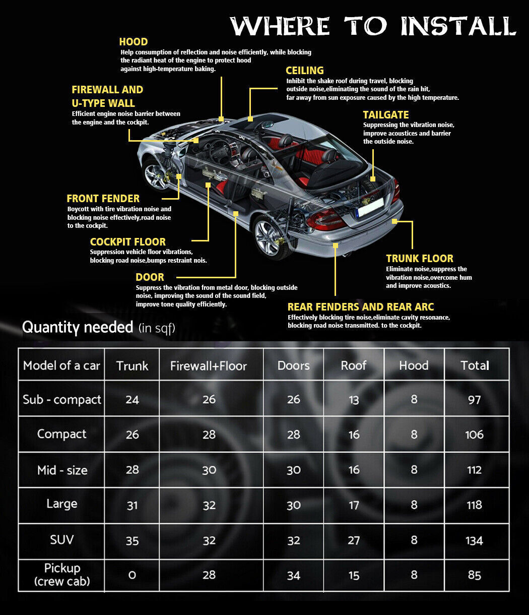 Installation: Remove the door panels Install the screws back in original place, it will easy be found when you mount, avoiding holes be covered Please clean the surface you want to paste. Make insulation materials and sheet metal firm fit, and play best adhesive, damping performance Can be used for the entire interior of any vehicle including: floor panel, door, carpet under/seat, headliner/roof, trunk, trunk lid, firewall (internal side).and so on. It is best not to repeatedly tear and paste during the successful installation process, otherwise the paste effect will be destroyed