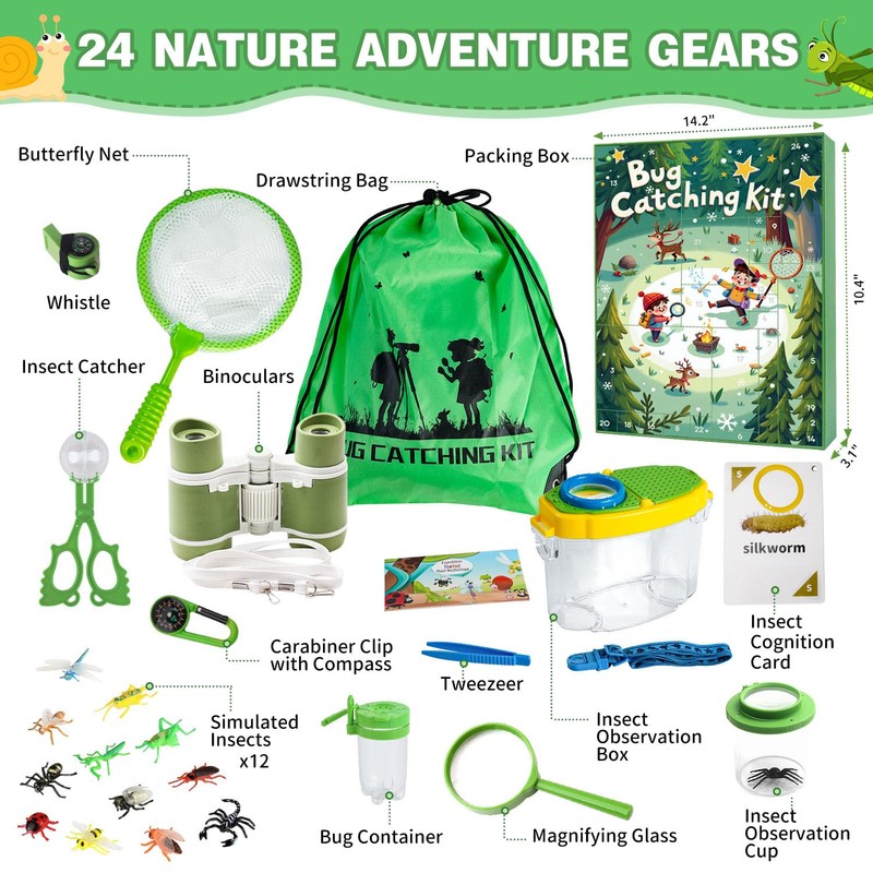 • 24-DAY ADVENTURE GIFTS FOR KIDS - Includes binoculars, an observation box, compass, whistle, magnifier, butterfly net, imitation insects, insect identification cards, and a brightly colored drawstring backpack for easy outdoor carrying and storage – and more! After the 24 days, all the gears form a complete bug-catching adventure kit, ready for sustainable use and countless future outdoor explorations.This bug catcher kit is the most vivid and memorable growth gift for your little adventurer