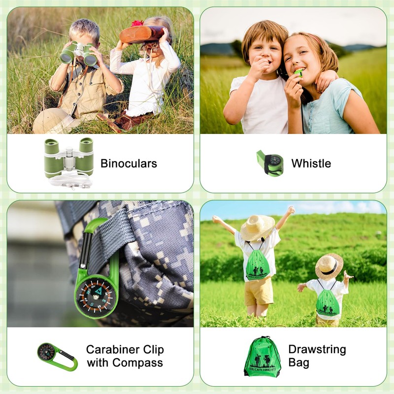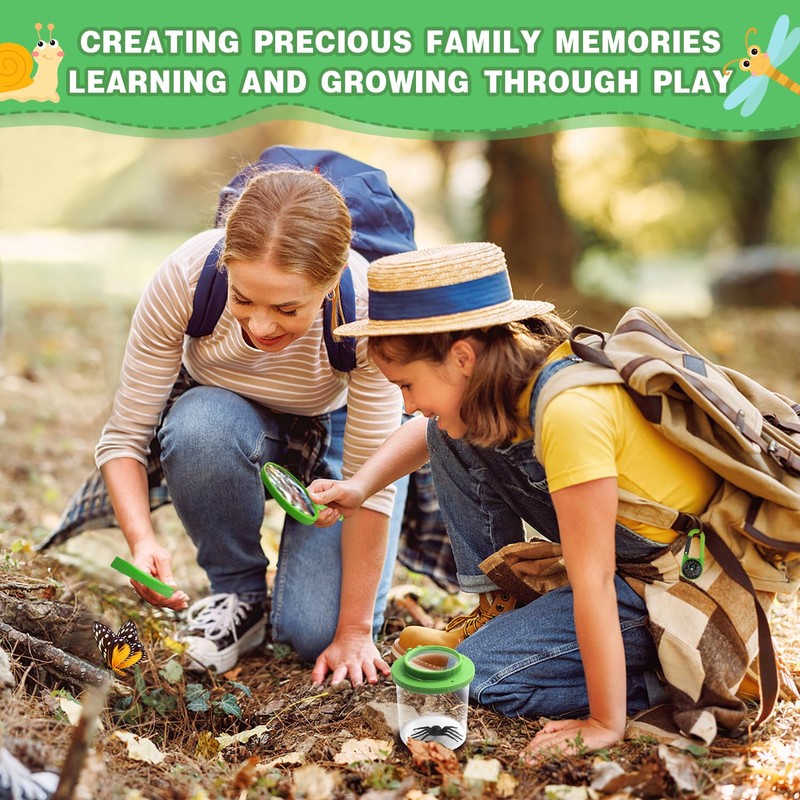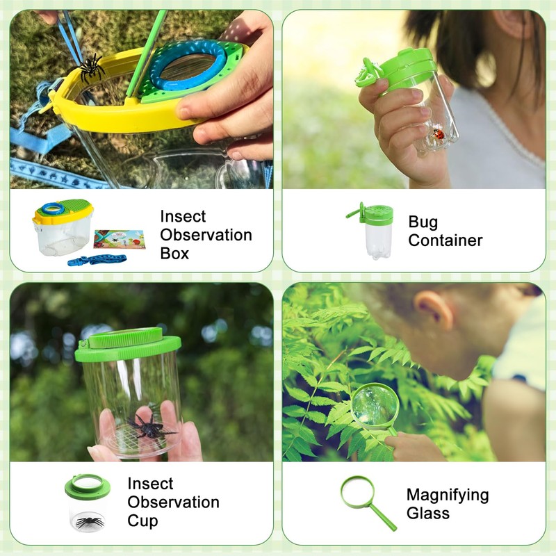 • LEARNING AND GROWING THROUGH PLAY - Observe the detailed texture of insects through the magnifying glass, learn to distinguish directions with the compass, and exercise concentration by tracking targets with binoculars. Swing the butterfly net to improve hand-eye coordination and organize the observation box to cultivate self-care ability. Searching tiny creatures in the grass fuels curiosity, turning every discovery into a lesson in loving and respecting nature.