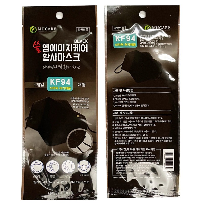 MHCARE 2-10 Individual Pack KF94 BLACK Face Mask Safety Protective Adult Made In Korea - 2 PCS MASK