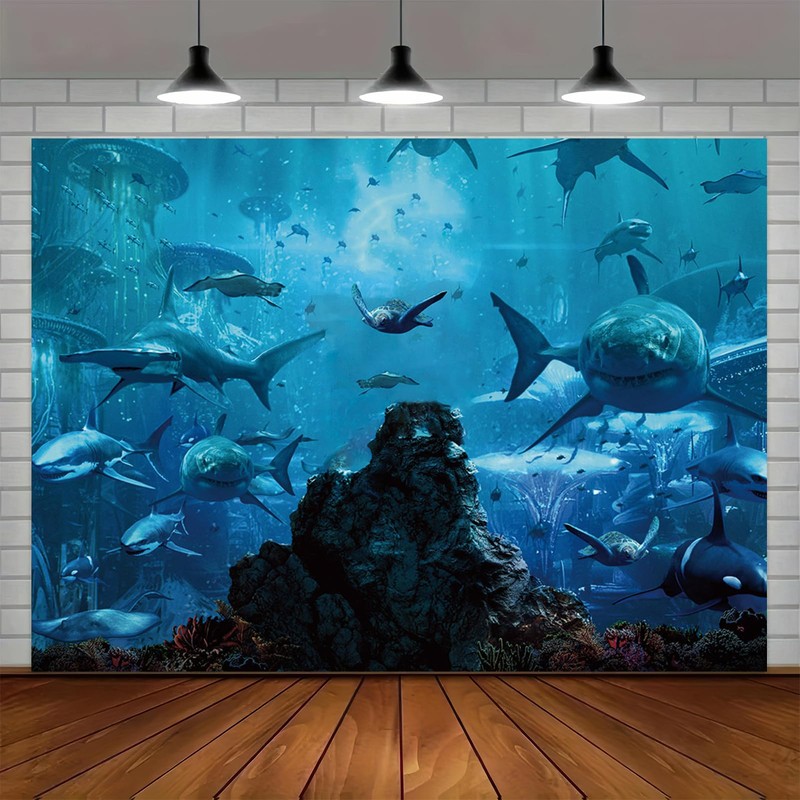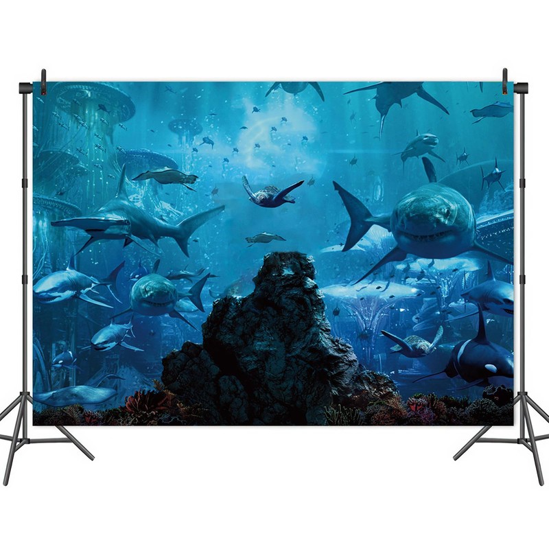 MHLSWY 7x5FT Shark Under The Sea World Photo Backdrop Aquarium Reef Photography Background Banner Polyester Fabric Studio Props Booth Video Shooting Decorations Supplies