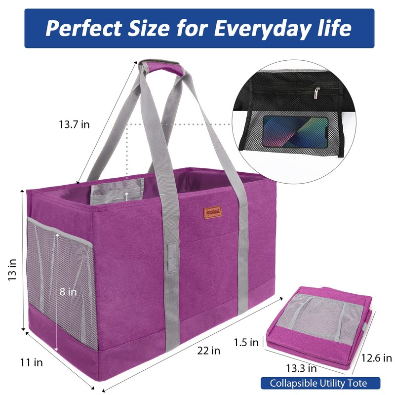 • Oversized:Reusable shopping bag has a large capacity. The tote bag measures approximately 22“*11”*13.5", providing plenty of storage space for shopping.Holds up to 100 lbs.It stands upright and stays open when filled, perfect for storing items
