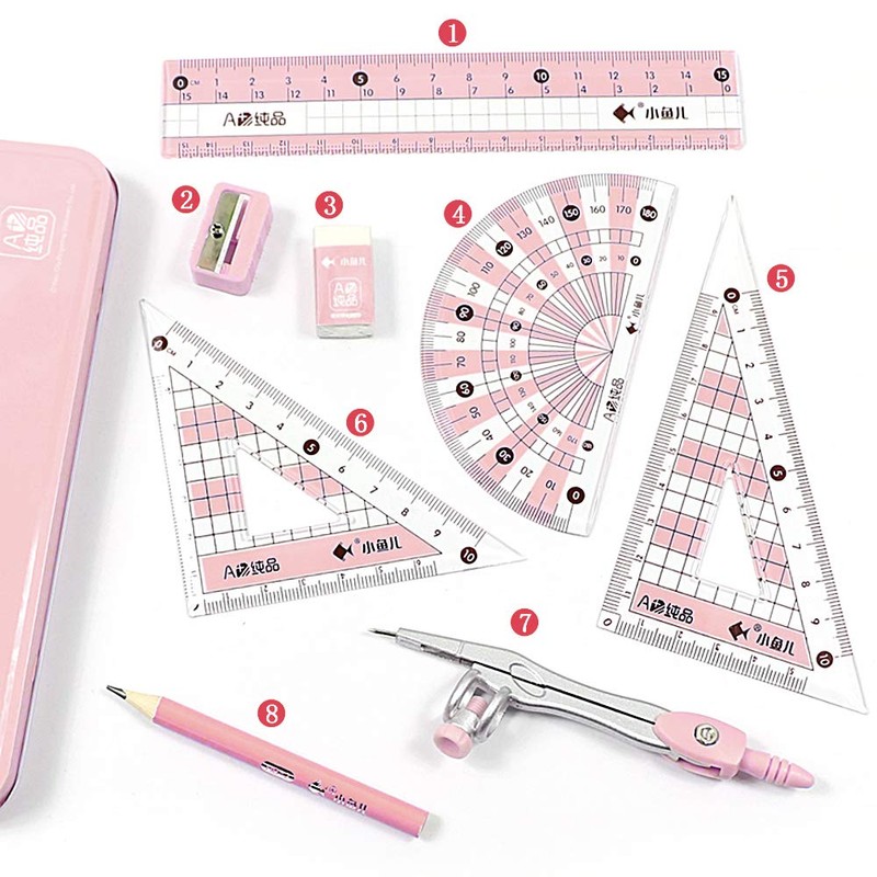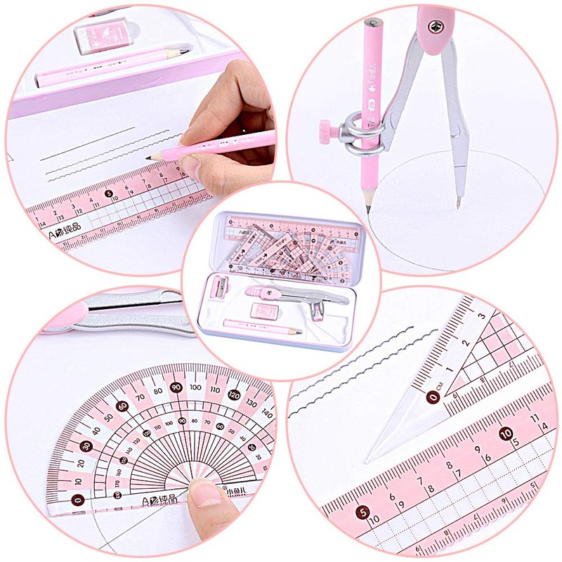 - Complete learning set: this compass primary school 4 grade set for secondary school contains 1 compass, 1 pencil, 1 eraser, 1 pencil sharpener, 1 protractor and 3 rulers. The rulers are made of high quality plastic, sturdy and not easy to break.
