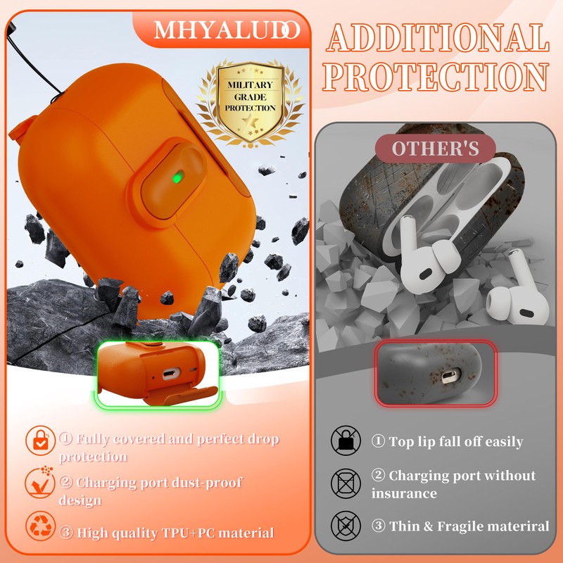 MHYALUDO AirPods Pro 2 Case with Closure & Military Drop Protection, Dustproof Charging Stand Sock, Lanyard & Scratch Resistant Case for AirPods Pro 2nd Generation with Visible LED, Orange
