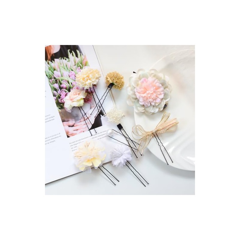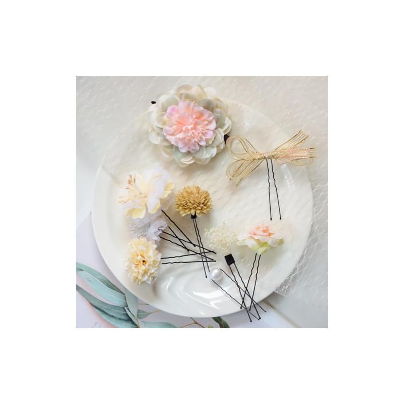 • デザイン性: 和洋折衷スタイルの髪飾りで、繊細な造花とパールを組み合わせた上品な仕上がり。特別な日のヘアスタイルを華やかに演出