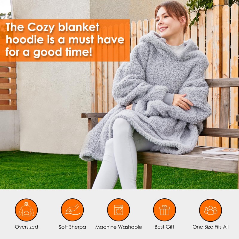 Mia&Coco Hoodie Blanket Women and Men, Oversized Hooded Blanket Hoodie with Pocket, 260GSM Sherpa Fleece Wearable Blanket Hoodie, OEKO-TEX Standards Cosy Hooded Blankets, Grey