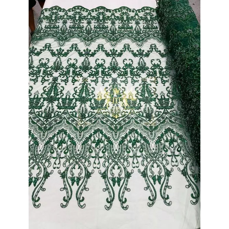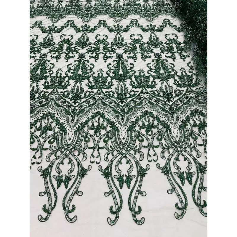 Mia Fabrics Hunter Green Beaded Fabric - Fancy Beaded Embroidered Damask Fabric By The Yard