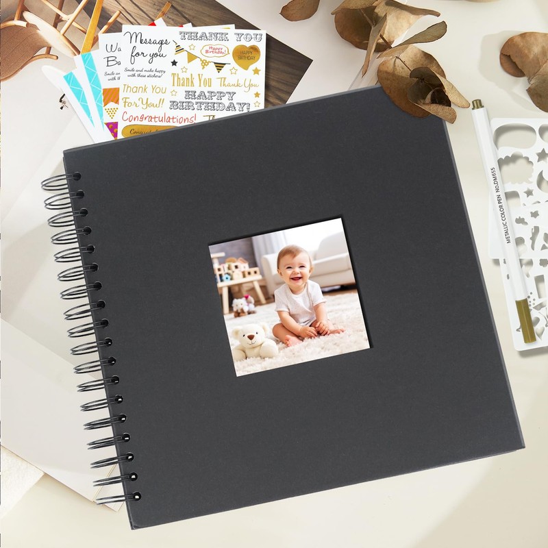 Miaikoe 25.5x25.5 cm DIY Scrapbook Album with Window Hardcover Kraft Blank Paper Scrap Book with 40 Sheets Photo Album for Guest Book, Family Wedding Anniversary (Black)