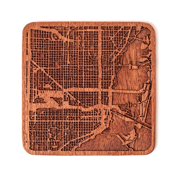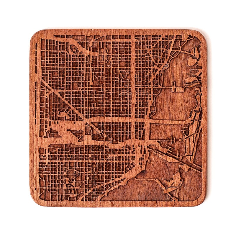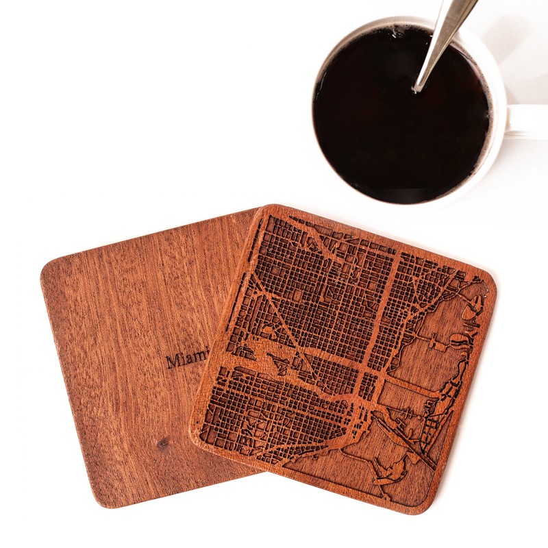 Miami Map Coaster by O3 Design Studio, 1 piece, Sapele Wooden Coaster With City Map, Handmade, Multiple city optional