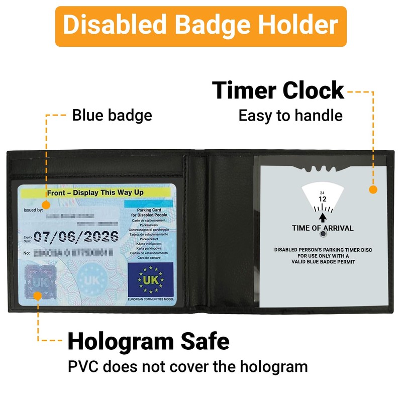 - PERFECT FIT FOR UK DISABLED PARKING PERMITS: Our premium disabled badge holder wallet is specially designed to fit the standard UK Blue Badge (17cm x 14cm) and timer clock disc perfectly. The transparent PVC pocket ensures your blue badge is clearly visible while protecting it from damage, with a separate compartment for your parking timer disc that doesn't obscure the hologram.