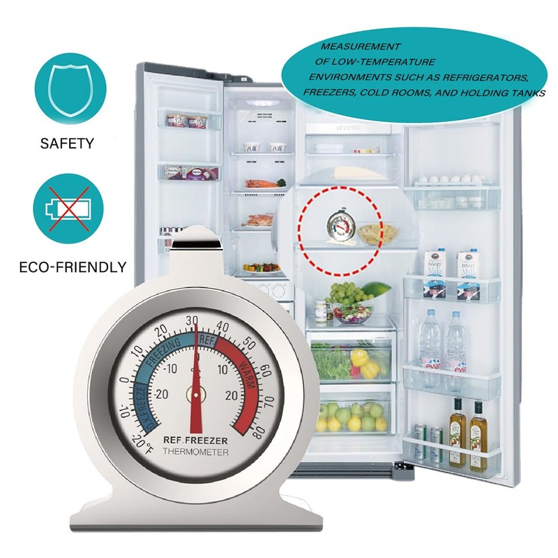 - EXQUISITE DESIGN: Refrigerator thermometer is designed with a hooked panel for hanging or placing in different locations, mechanical design for instant readings, freezer thermometer does not require battery power.