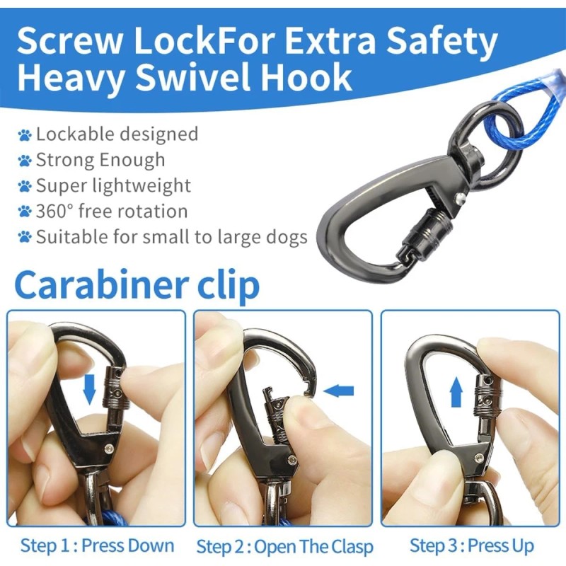 - Upgrade Heavy Duty Locking Carabiner & 360° Tangle Free--Unlike most ordinary dogs with buckles, our dog leash The clips ends are equipped with a sliding barrel type lock, stronger and more durable, which prevents the latch from opening and the dog getting loose,The dog cable 360° rotating design keeps the cable stay tangle free no matter how many times the dog turns around!The ideal choice for walking,running,hiking,yard,beach,etc.