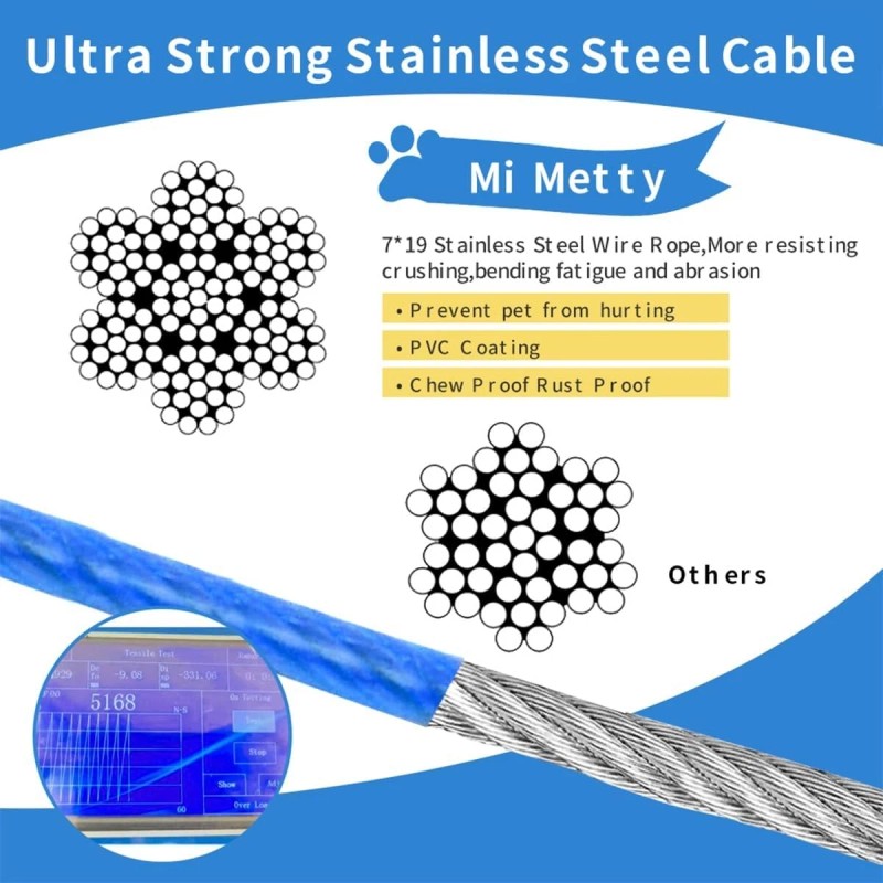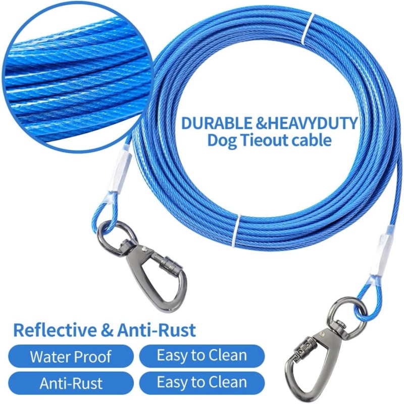 - Ultra Strong Dog Tie Out Cable--The inner core of our dog tie out rope is consits 7*19 stainless steel wire with chew proof PVC coating which is the most tightly twisted and most durable structure of dog cable,Our dog tie out have been professionally tested for tensile and quality,providing superior strength and durability against breakage,Good corrosion resistance, will be reliable to use,it's perfect for dogs up to 300LBS.