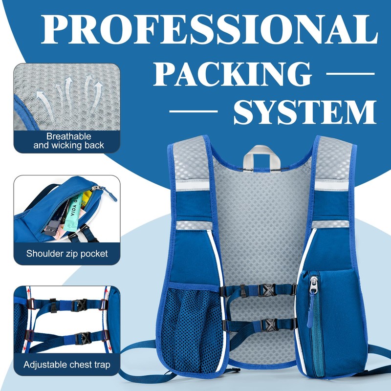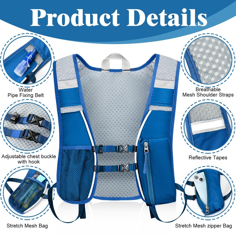 - 【Plenty of Storage】- This blue running vest small storage compartments on front, and a large mesh pocket on the back, stash your energy gels, snacks, keys, cash, towel and any other essentials you need while running.