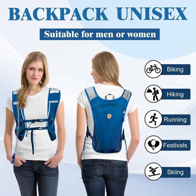 MIAOJIE Running Hydration Vest Backpack, Adjustable Chest Straps Running Hydration Vest, Vest Lightweight, Breathable and Sweatproof Running Backpack for Cycling Hiking Rave for Men Women (Blue)
