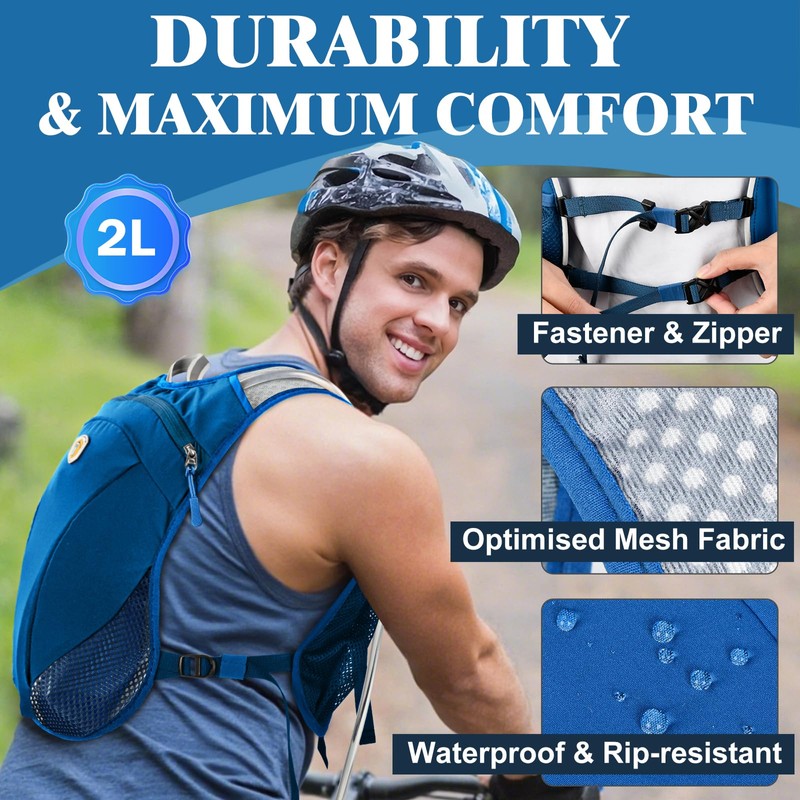 - 【Ultralight Running Vest】Blue Water-resistant hydration vest, skin-friendly won't rub your shoulders and neck. The size of the hydration pack is 35.56cm x 22.86cm/ 14 in x 9 inch, It barely tips the scales at 0.72 ounces, ensuring it won't slow you down.