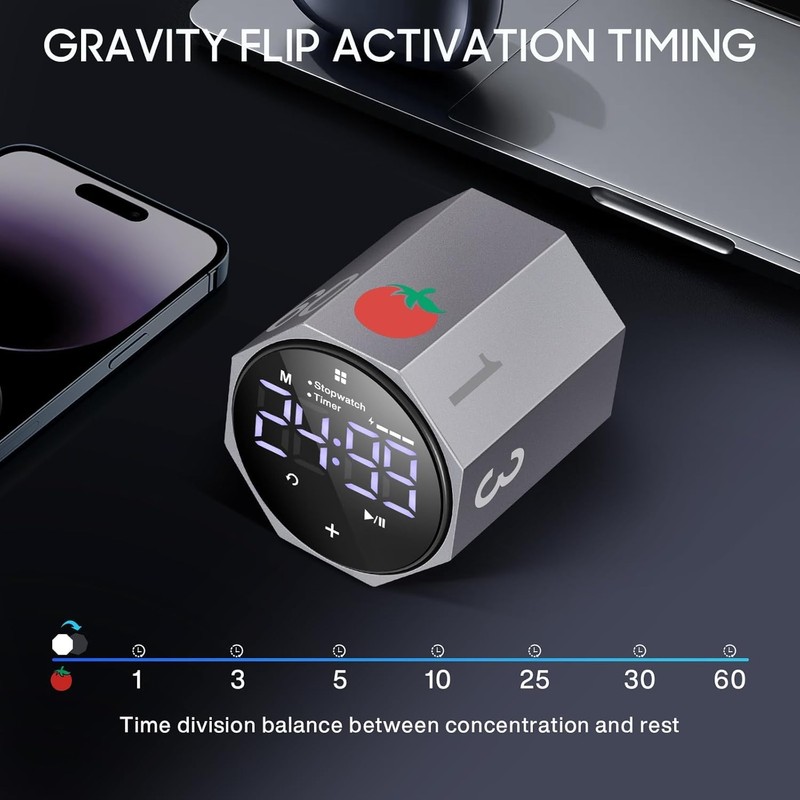 - 【Full Metal & Cctagonal Frosted Texture】 Productivity timer uses aluminum alloy full metal material, weight: 135 g, size: 1.9 * 1.9 * 2.1 inch, light and portable, easy to put into a backpack and pocket. Octagonal metal frosted simple design, not only beautiful but also durable. Suitable for travel, work and study.