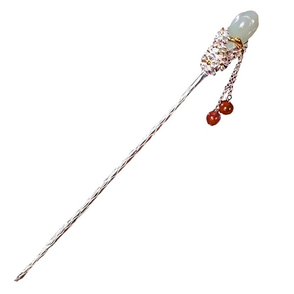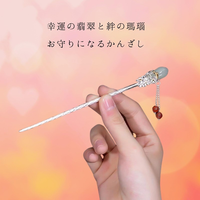 【商品特徴】銀メッキで繊細に作られた花モチーフは「純潔」「優美な女性」という花言葉を持ち、あなたの清楚な魅力を引き立てます。先端に輝くのは、古来より「成功と繁栄」の象徴とされる人工合成翡翠。そして、揺れるたびに視線を集めるのは「絆」と「勇気」を象徴する赤瑪瑙です。大切な人との絆を深め、新しい一歩を踏み出す勇気を与えてくれるお守りのような存在に。この簪を身に着けることで、あなたの日常に幸運と自信が舞い込み、内面から輝く美しさを手に入れることができるでしょう