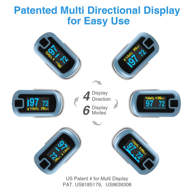 - LUXURY AND RELIABILITY: Our accurate dual color oximeter displays SpO2 in 4 directions, 6 display modes, and 10 levels of adjustable brightness. Comes with a battery-low indicator. Suitable for all ages
