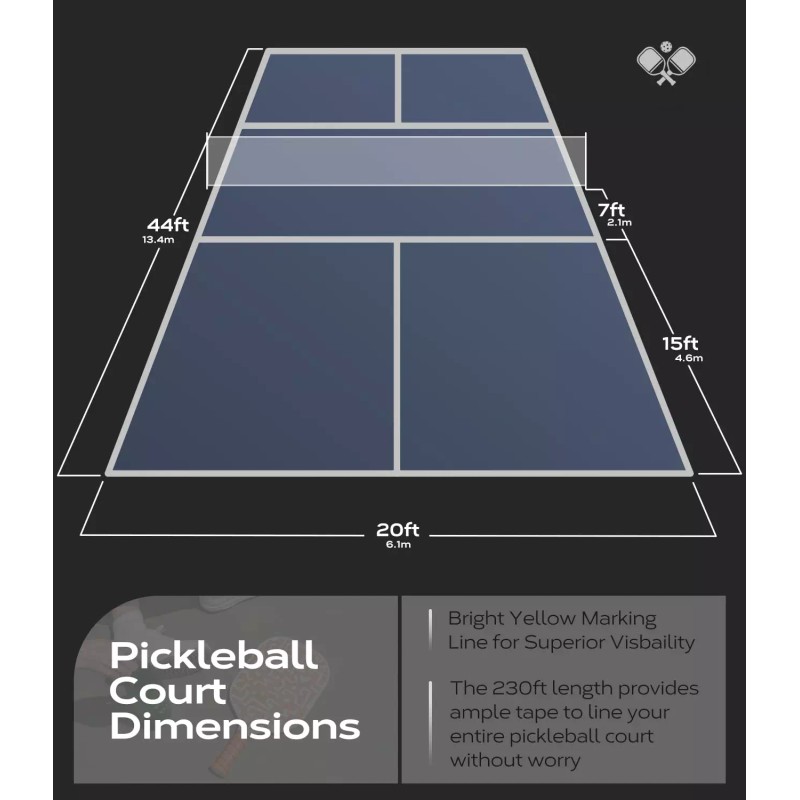 - This cloth and vinyl tape comes in a roll that is 230 feet long and 2 inches wide, providing ample tape to line your entire pickleball court.