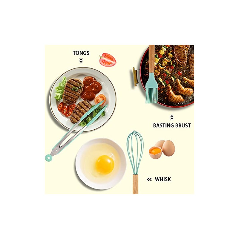 MIBOTE MIBOTE Silicone Cooking Kitchen Utensils Set with Holder, Wooden Handles Cooking Tool BPA Free Turner Tongs Spatula Spoon Kitchen Gadgets Set for Nonstick Cookware (Teal)