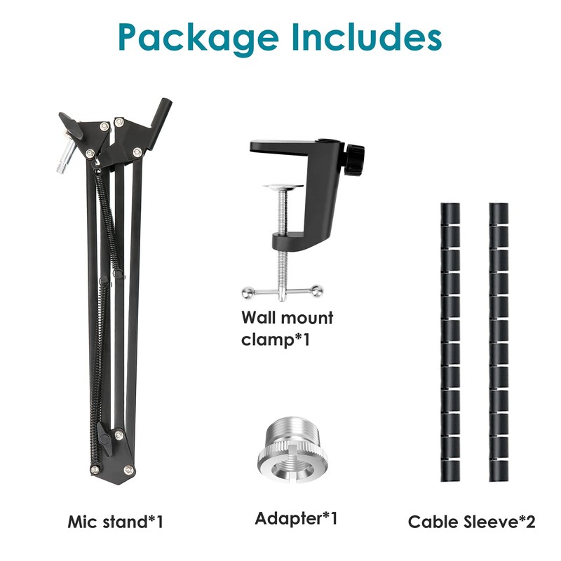• All-in-one Combo - Package includes mic boom arm, table mounting clamp, 3/8" to 5/8" screw adapter and 2pcs cable sleeve. NOTE: Not Included Fifine K688 Microphone.