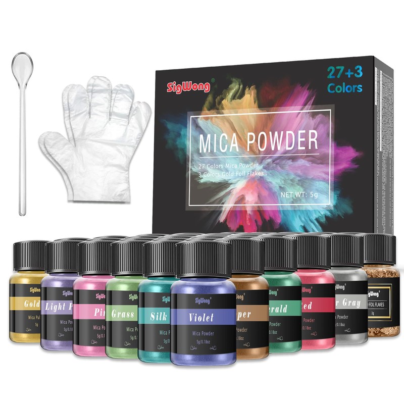 - 【STUNNING COLORS】: SigWong Mica Powders Set Include: 27 colors mica powders 5g/0.18oz and 3 colors gold foil flakes 2g. The gold foil flakes are gold, silver and copper colors, which are not easy to fade and oxidize, they can be paired mica powder create a stunning shiny textured effect to make your crafts look special. So let your imagination run wild and add some color to your life.