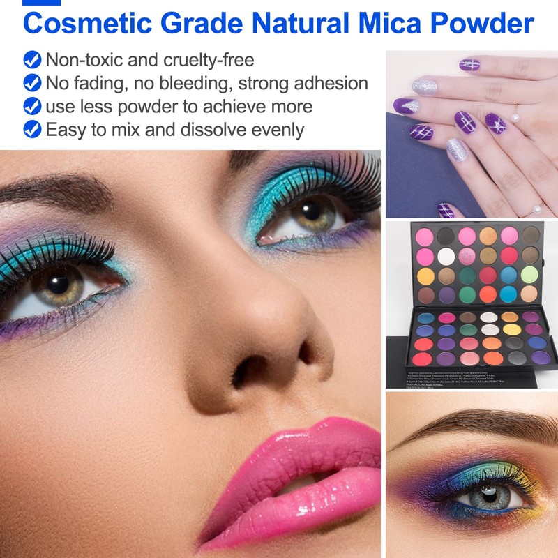 - 【Wide Application】:This mica powder of Cosmetic grade is a great way to create something unique and pleasing to the eye.Perfect for eye shadow,lip gloss,resin arts,acrylic paint,tumbler,coaster,nail polish,soap making,bath bomb,slime pigment,candle making and so much more.