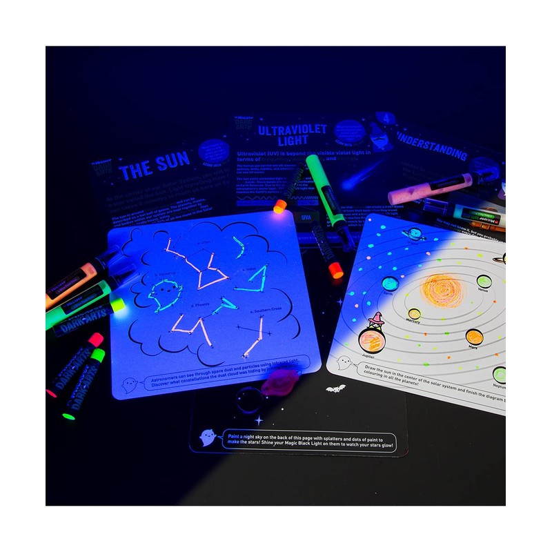 - INCLUDES PASTELS, PENS, AND MORE - Pack comes with eight STEAM-based double-sided activity cards (educational facts on one side & an art activity and experiment on the other side), six each of neon glow pastels, and glow-in-the-dark paint pens, and a mini black light torch
