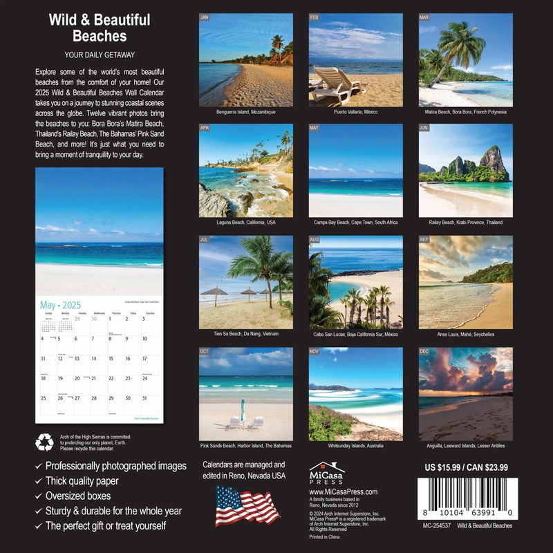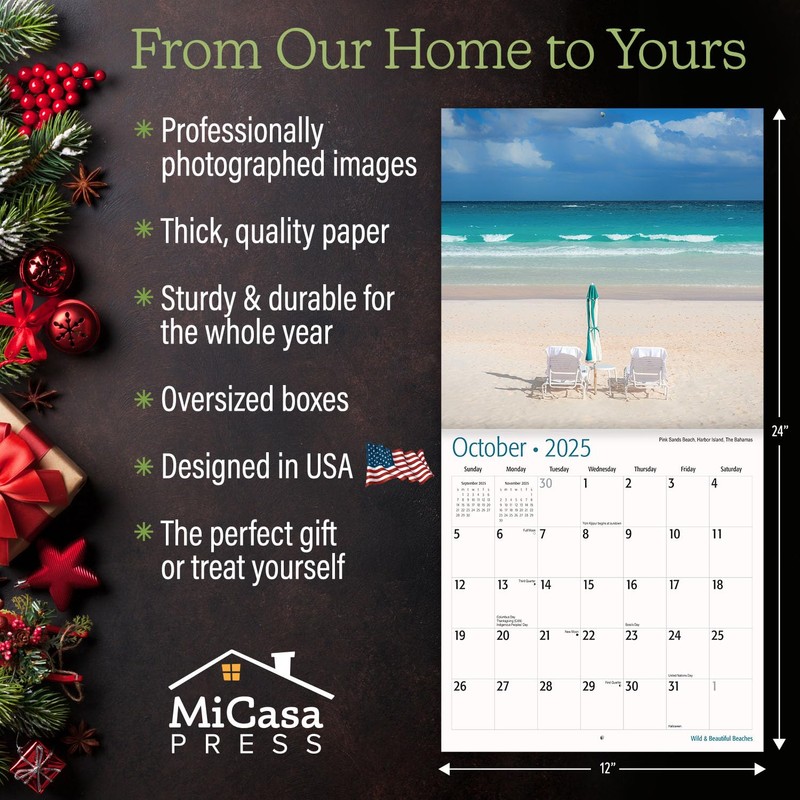 MICASA Wild & Beautiful Beaches 2025 Hangable Monthly Wall Calendar | 12" x 24" Open | Thick & Sturdy Paper | Giftable