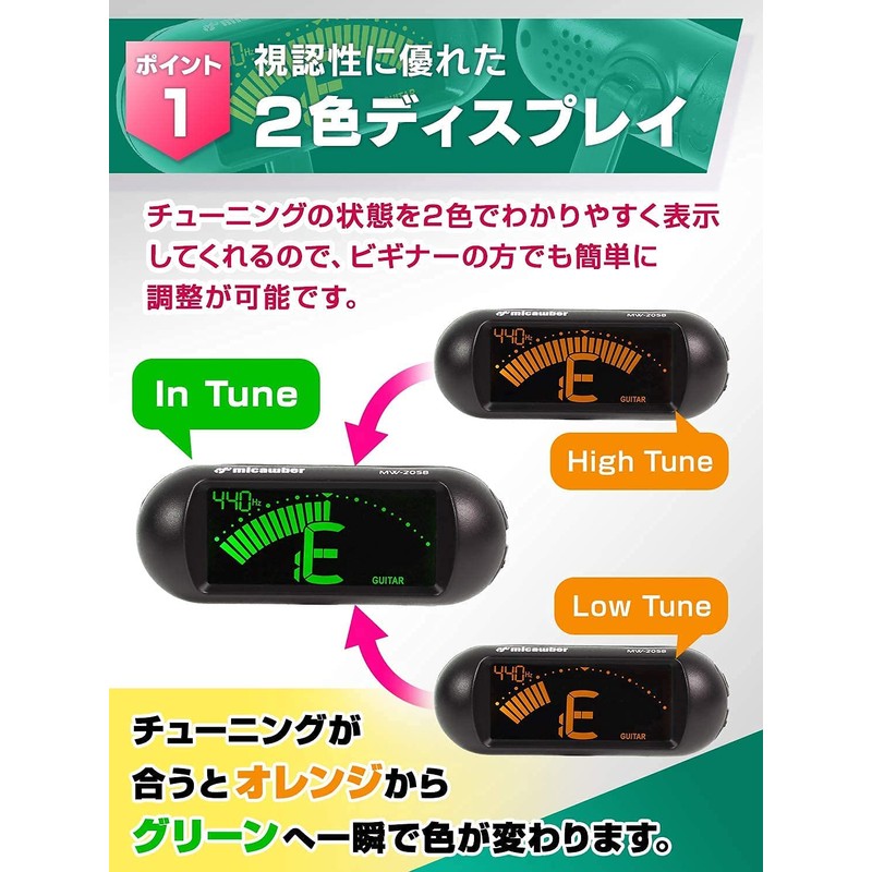 - Tuner with 2-color display for easy sound judging: The MW-2058 displays in both orange and green. The MW-2058 is a simple and easy-to-understand item that can be used to distinguish only two different colors.It is highly simple and easy to understand. Whether you are a beginner guitar or a beginner to a ukulele, or a middle-aged group who enjoys band activities