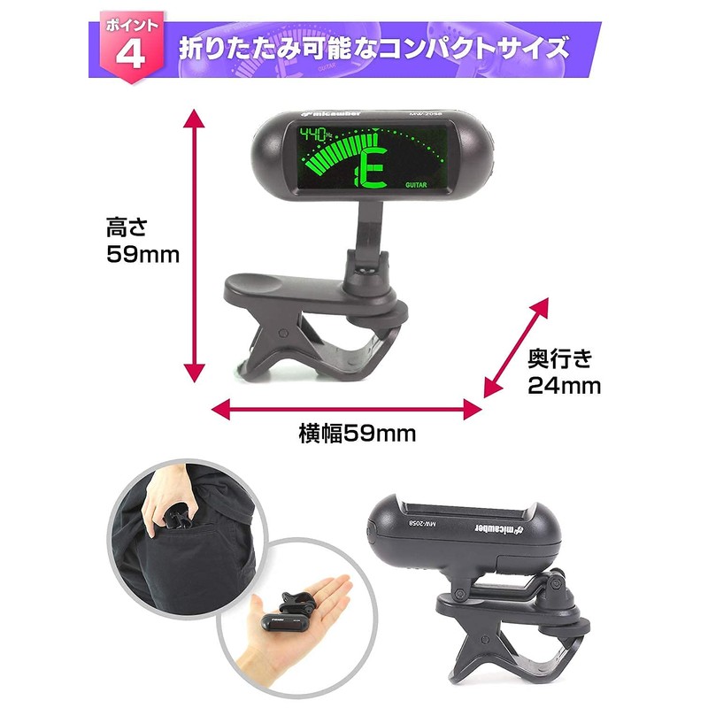 - (Easy to Operate and Handle) Clip on the head of the string instrument for easy installation. It instantly detects the slight beings of a string and tells the player the optimum sound. The MW-2058 is equipped with an auto off feature, and the power will automatically turn off when not using it continuously for 5 minutes to prevent battery from being worn out. The "A4 button" allows you to change A4 frequency. (Measurement Range: A4: 410 Hz - 490 Hz)